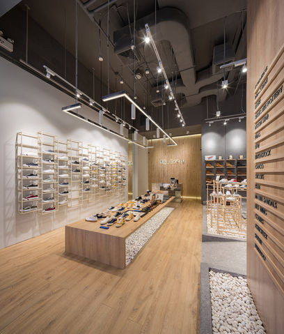 ในส่วนงานตกแต่งโดยรอบร้านเน้นให้เรียบเพื่อขับสินค้าให้ดูเด่น ตัวแท่นโชว์กลางร้านออกแบบให้เหมือนพื้นไม้นั้นถูกยกขึ้นมาอย่างเบาลอย ไร้น้ำหนัก ให้ดูเด่นแปลกตาเมื่อมองจากทางเข้าหลัก และในส่วนพื้นที่สวนหินนั้นเราออกแบบให้มีชั้นวางรองเท้าที่เป็นไม้ขัดต่อกันเป็นโครง แบบการต่อโครงสร้างบ้านไม้สมัยก่อน รวมถึงออกแบบสัดส่วนของพื้นหินทางเดิน ให้ได้บรรยากาศเหมือนเดินอยู่ในสวนหินสไตล์ญี่ปุ่นจริงๆ